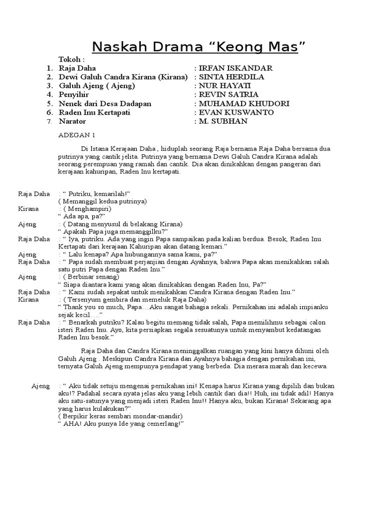 Naskah drama keong maskeong masnuju sawijining dinten raden inu kertapati lan candra kirana wonten ing krajaan ngwontenake parepatan kangge ngrembag babagan nikahane raden inu kertapati kaliyan candra kirana. Pagi itu disebuah sekolah sma, bayu berlari menghampiri jono, liyana, nina, ardi, mira, cici dan ahmad. Naskah drama keong mas bahasa jawa. Ratna dwi herwiyanti 071644031 santi suryani 071644033 hellane dwi s. Legenda danau toba dalam, bahasa inggris.